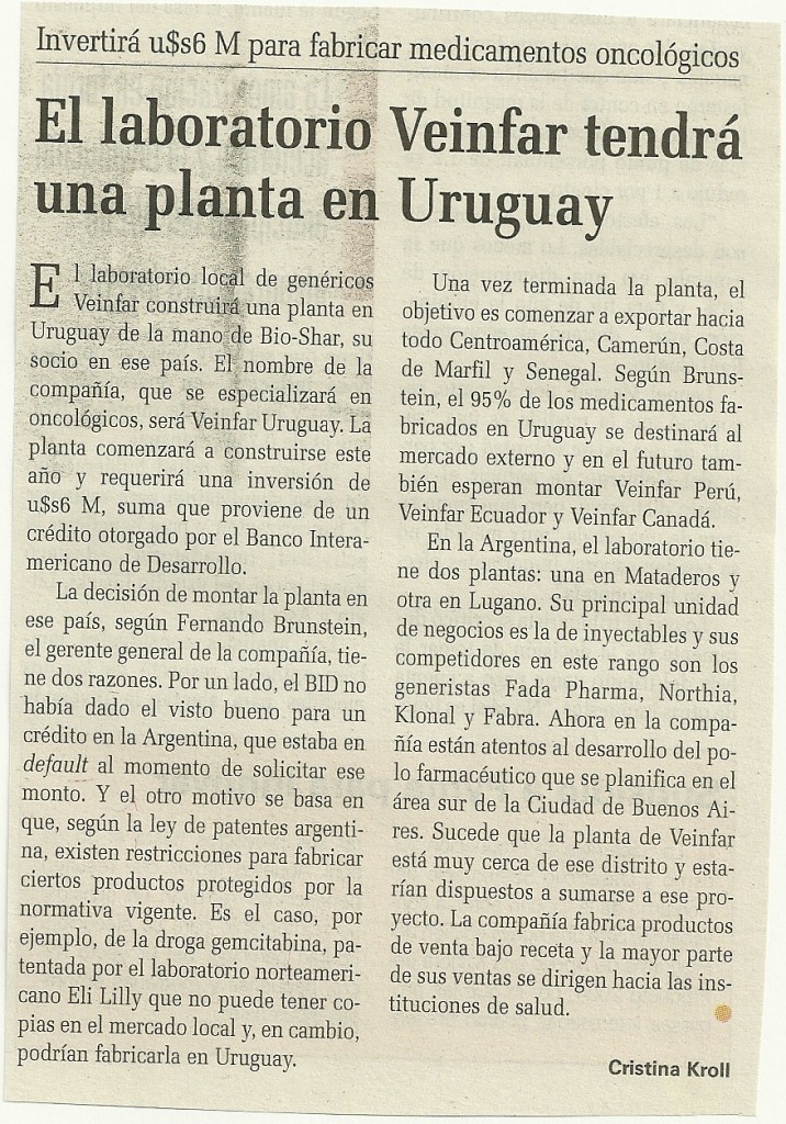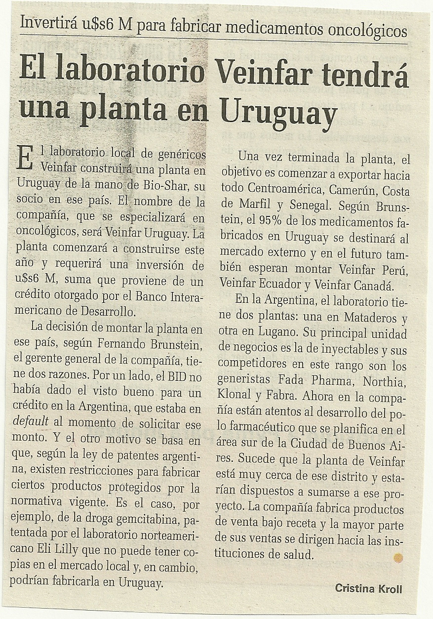 El laboratorio local de genéricos Veinfar construirá una planta en Uruguay de la mano de BioShar, su socio en ese país. El nombre de la compañía, que se especializará en oncológicos, será Veinfar Uruguay. La planta comenzará a construirse este año y requerirá una inversión de u$s6 M, suma que proviene de un crédito otorgado por el Banco Interamericano de Desarrollo.