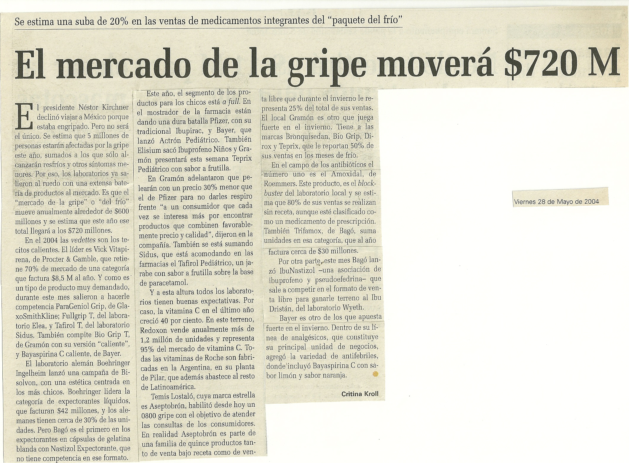 El presidente Néstor Kirchner declinó viajar a México porque estaba engripado. Pero no será el único. Se estima que 5 millones de personas estarán afectadas por la gripe este año, sumados a los que sólo alcanzarán resfríos y otros síntomas menores. Por eso, los laboratorios ya salieron al ruedo con una extensa batería de productos al mercado. Es que el «mercado de la gripe» o «del frío» mueve anualmente alrededor de $600 millones y se estima que este año ese total llegará a los $720 millones.
