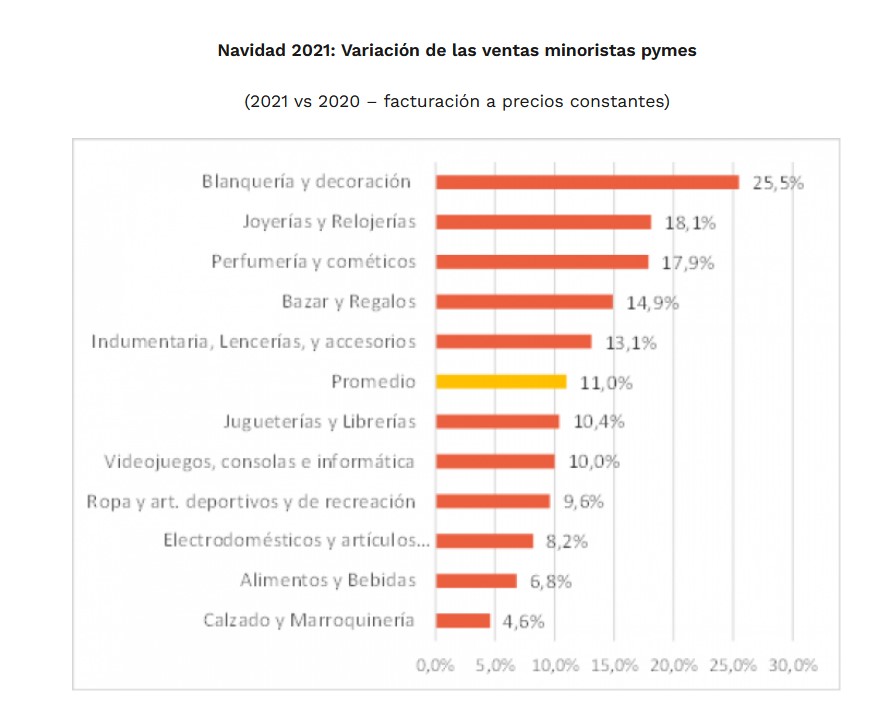 Los sectores de mayor crecimiento este año fueron: Blanquería y Decoración que avanzó un 25,5%; Joyerías y Relojerías que mejoró un 18,1% y Perfumería y Cosméticos que creció un 17,9%. En cuarto lugar, Bazar y Regalería vio una mejora del 14.9%.