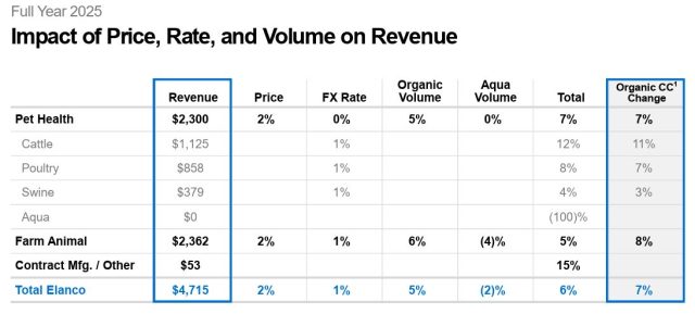 Hoy, martes 24 de febrero, Elanco Animal Health, que supo ser una subsidiaria de Eli Lilly hasta 2019, publicó sus estados financieros correspondientes al 2025. En ese período, la multi que lidera Jeff Simmons generó ventas por u$s 4.715 M, una suba del 7% en términos orgánicos. Ver Press Release