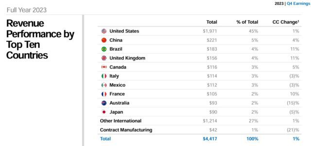 En términos geográficos, Elanco obtuvo el 45% de sus ingresos del 2023 en Estados Unidos. Allí creció un 1% en moneda constante a u$s 1.971 millones. China, su segundo mercado más relevante, ganó un 4% a u$s 221 millones. El podio lo completa Brasil que creció 11% a u$s 183 millones.