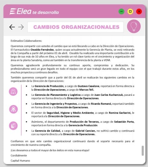 A su vez, la gerencia de Calidad, capitaneada por Gabriel Cancian, no estará sujeta a cambios y continuará reportando a la misma Dirección, tal como hasta el momento. En tanto, otra de las novedades viene de la mano del departamento de Producción de Terceros. Este área, que se encuentra bajo la responsabilidad de Sebastián Porta, le rendirá cuentas a la gerencia de Producción.