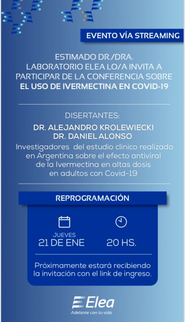 El meeting virtual, que será hoy, jueves 21 de enero a las 20hs, tendrá como disertantes a Alejandro Krolewiecki y a Daniel Alonso. Ambos, médicos de profesión, son investigadores en los ensayos clínicos sobre ivermectina que se están realizando en el país.
