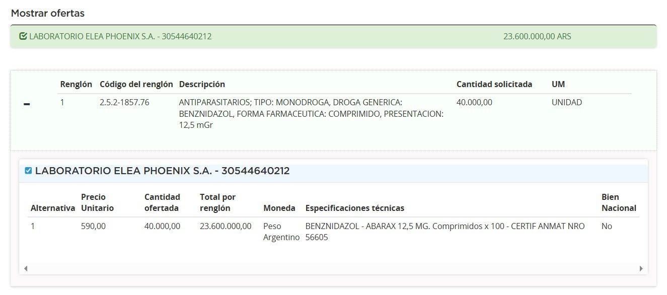 El proceso, cuyo contrato de provisión tendrá una extensión de un año, está conformado por un solo renglón. Para el mismo se requieren 4000 cajas, cada una con 100 comprimidos disgregables de benznidazol 12,5mg, indicado para la Enfermedad de Chagas. Ver Pliego