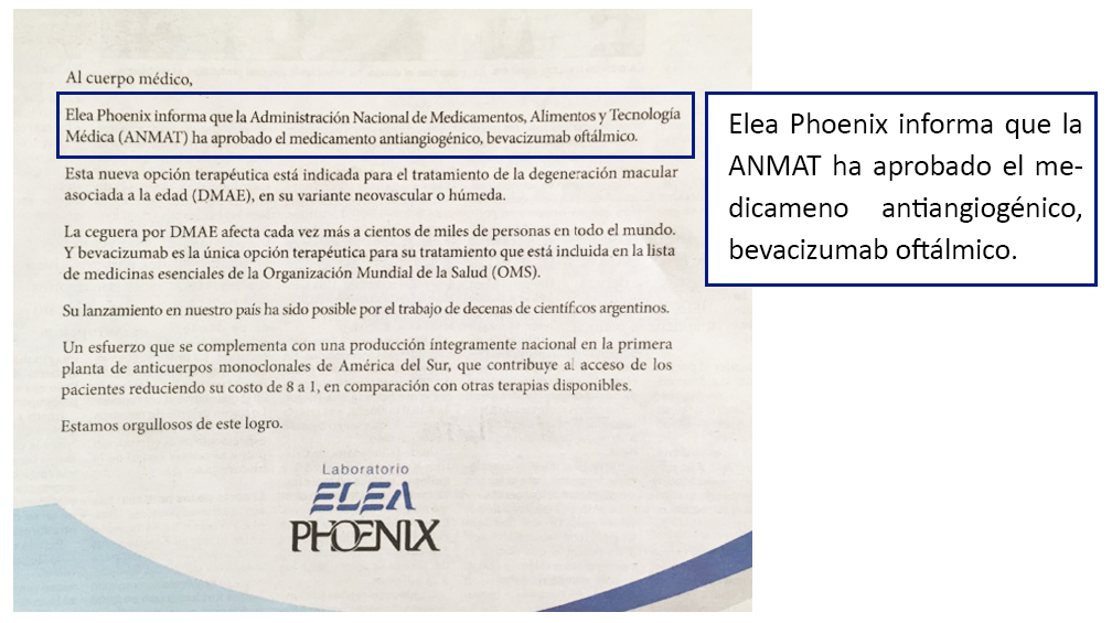 El nacional Elea consiguió una aprobación en la Argentina que hasta ahora era off label. Fue para su biosimilar Lumiere usado en oftalmología. Tal decisión se convirtió en polémica, ya que el mercado considera que dicho aval está «flojo de papeles». El mismo quedó bajo la responsabilidad de la cuestionada funcionaria de la ANMAT, Patricia Aprea.