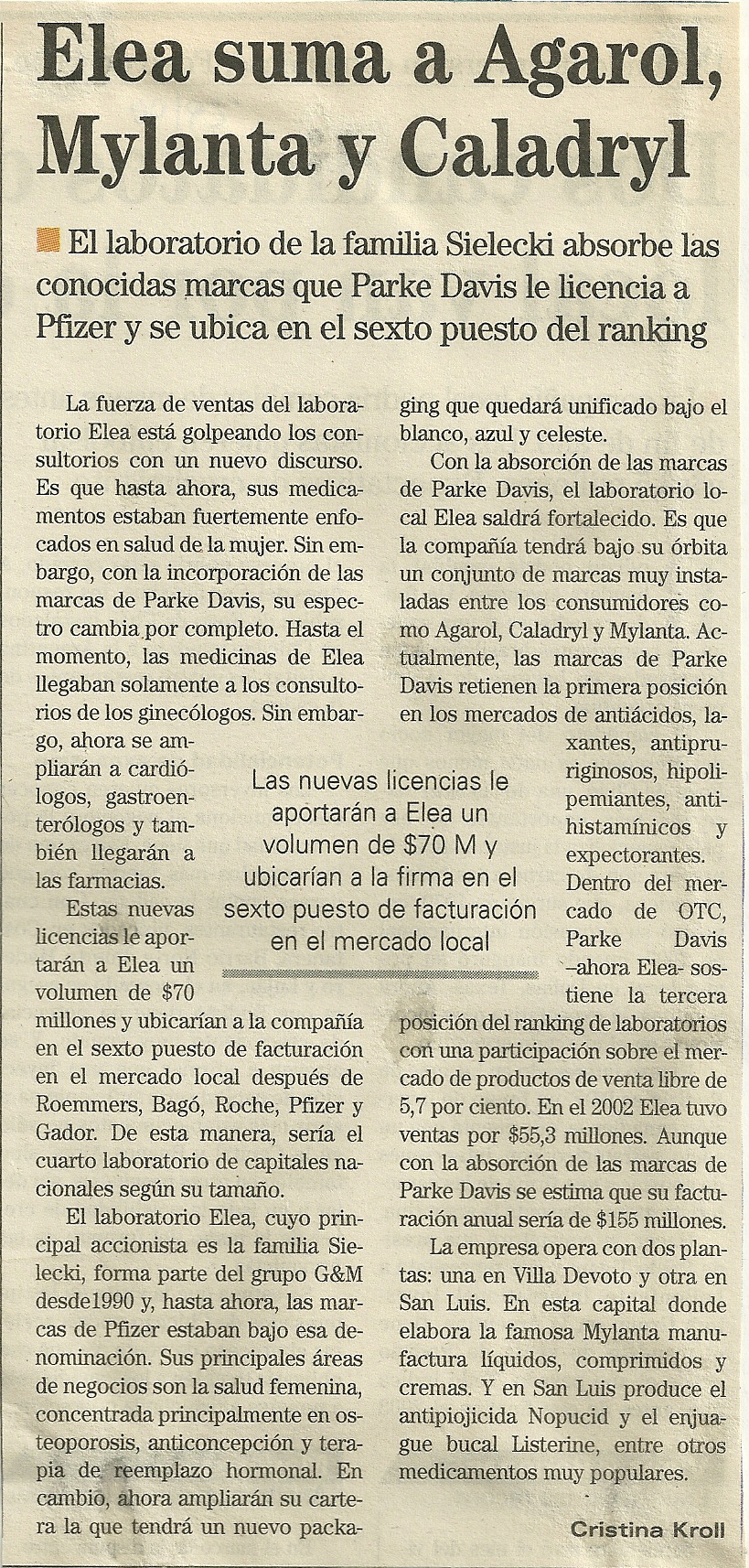 Con la absorción de las marcas de Parke Davis, el laboratorio local Elea saldrá fortalecido. Es que la compañía tendrá bajo su órbita un conjunto de marcas muy instaladas entre los consumidores como Agarol, Caladryl y Mylanta. Actualmente, las marcas de Parke Davis retienen la primera posición en los mercados de antiácidos, laxantes, antipruriginosos, hipolipemiantes, antihistamínicos y expectorantes.