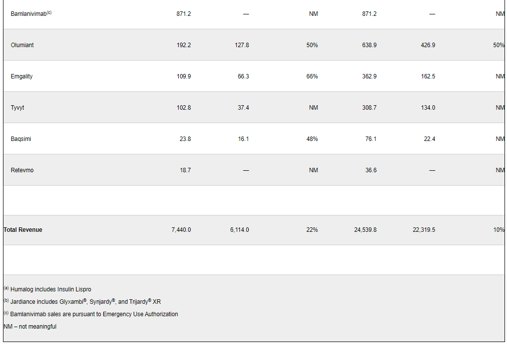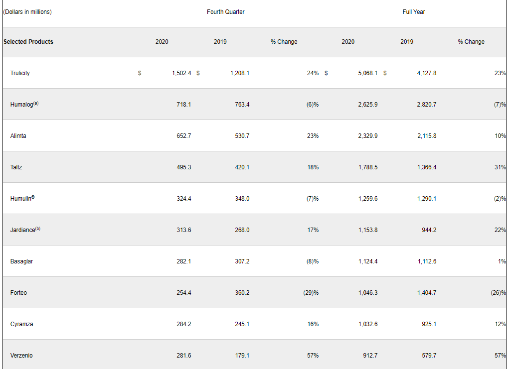 Dentro de su portafolio, el producto que mayores ingresos aportó a la caja de la farmacéutica fue Trulicity, para diabetes tipo 2, que durante 2020 creció un 23% a u$s 5.068,1 millones. El podio lo completaron la insulina Humalog con u$s 2.625,9 millones (-7.0% interanual) y el antipsoriásico Taltz con u$s 1.788,5 millones (+31%).