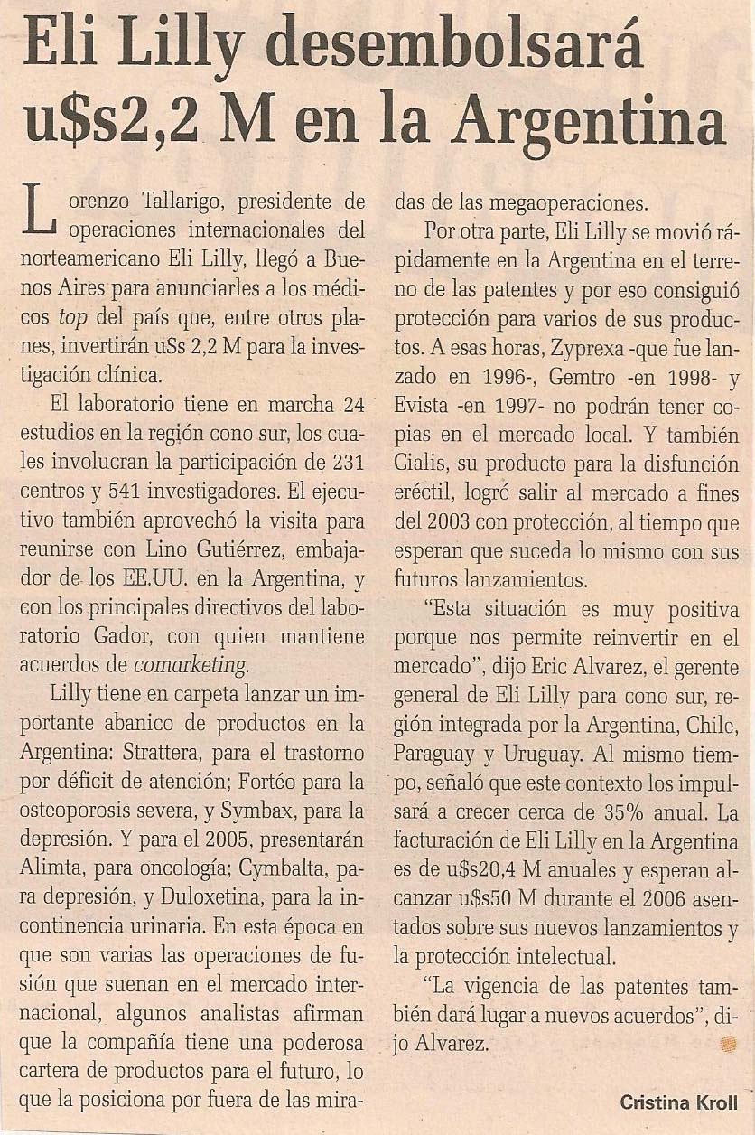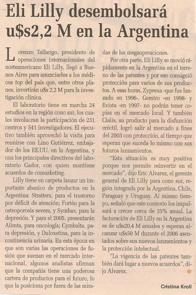 «Esta situación es muy positiva porque nos permite reinvertir en el mercado», dijo Eric Alvarez, el gerente general de Eli Lilly para cono sur, región integrada por la Argentina, Chile, Paraguay y Uruguay. Al mismo tiempo, señaló que este contexto los impulsará a crecer cerca de 35% anual. La facturación de Eli Lilly en la Argentina es de u$s20,4 M anuales y esperan alcanzar u$s50 M durante el 2006 asentados sobre sus nuevos lanzamientos y la protección intelectual.