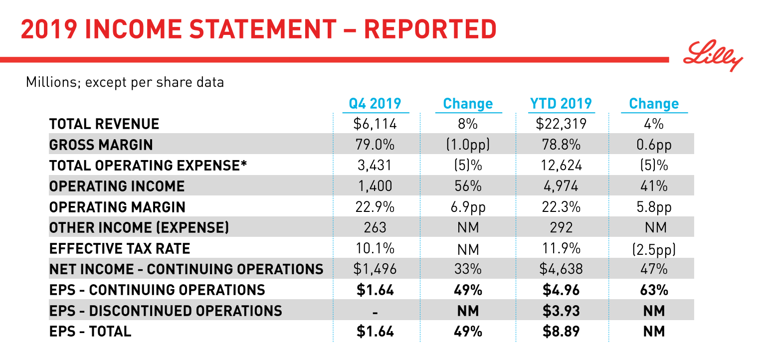 La norteamericana Eli Lilly difundió los resultados de su desempeño financiero para el 2019, con ingresos por u$s 22.319 millones, y una variación del 5% en comparación con el 2018 en moneda constante.
