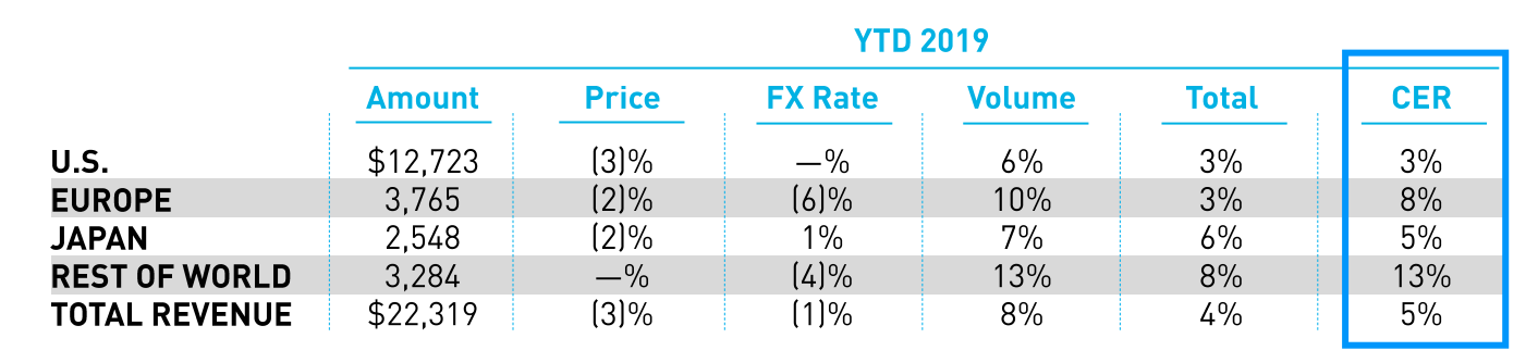 Por mercados, lo que la norteamericana considera como «Resto del mundo» fue la región que más creció en moneda constante, con un 13%. En segundo lugar quedó Europa, con 8%, seguida por Japón que subió un 5%. Dentro de los Estados Unidos, Eli Lilly tuvo un aumento del 3% en facturación.