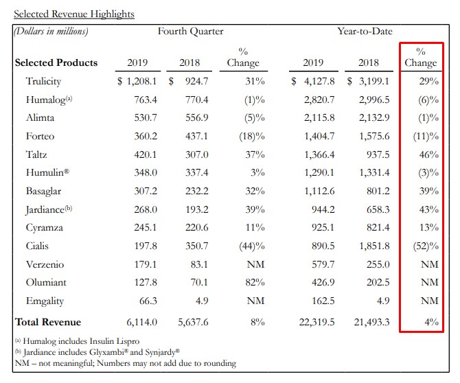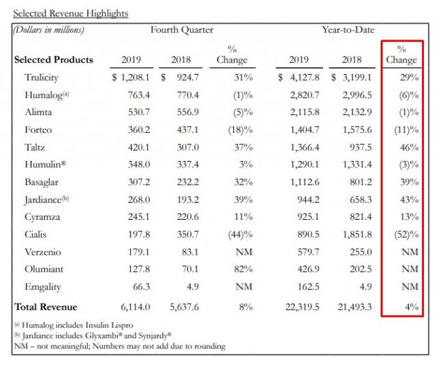 Para completar el podio, la insulina Basaglar tuvo un 2019 en el que creció un 39% y vendió u$s 1.112 millones. El quinteto de productos conformado por Taltz; Jardiance; Basaglar; Trulicity; y Cyramza, le representó a la multi casi el 50% de su facturación. Ver artículo.