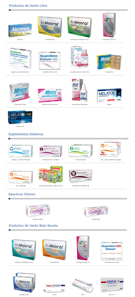 Elisium tiene cuatro áreas de negocios: productos de venta libre entre los que sobresalen Mejoral y Melatol. También productos de venta bajo receta, y reactivos. En esta última división sólo tiene al test de embarazo Confielle.