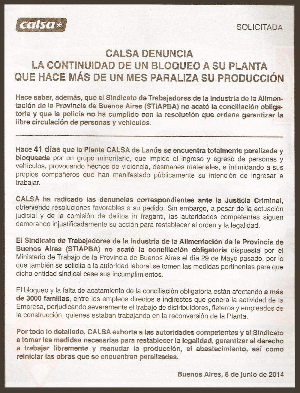 Sucede que la toma de la planta de la alimenticia Calsa en la localidad de Lanús lleva casi un mes y medio y la falta de productos ya está resintiendo al laboratorio conducido por Martín Fraga. Ver video.