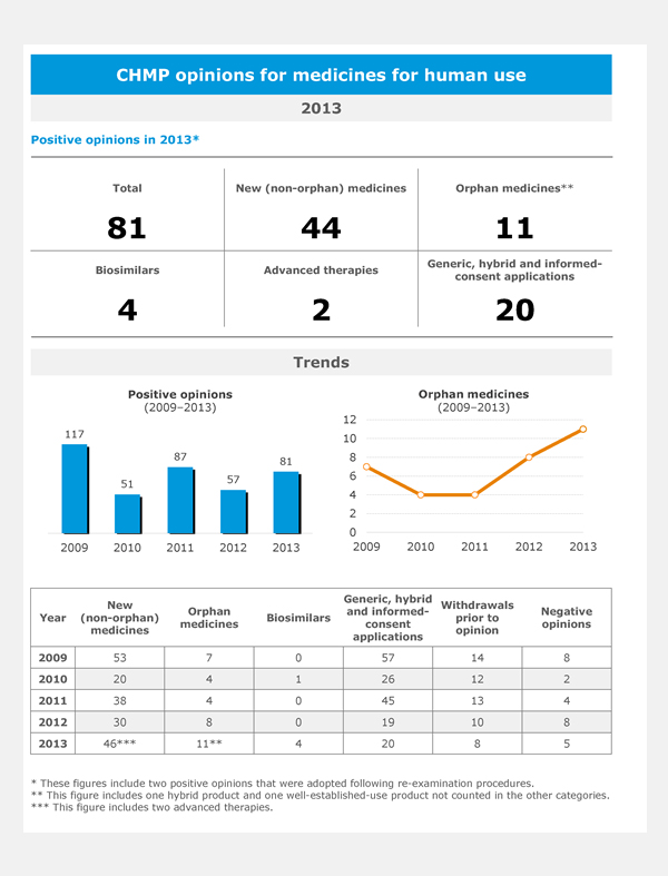 El comité de Productos Medicinales para Uso Humano de la agencia regulatoria de medicamentos de Europa recomendó 81 medicinas para que sean aprobadas durante 2013. Ver documento.