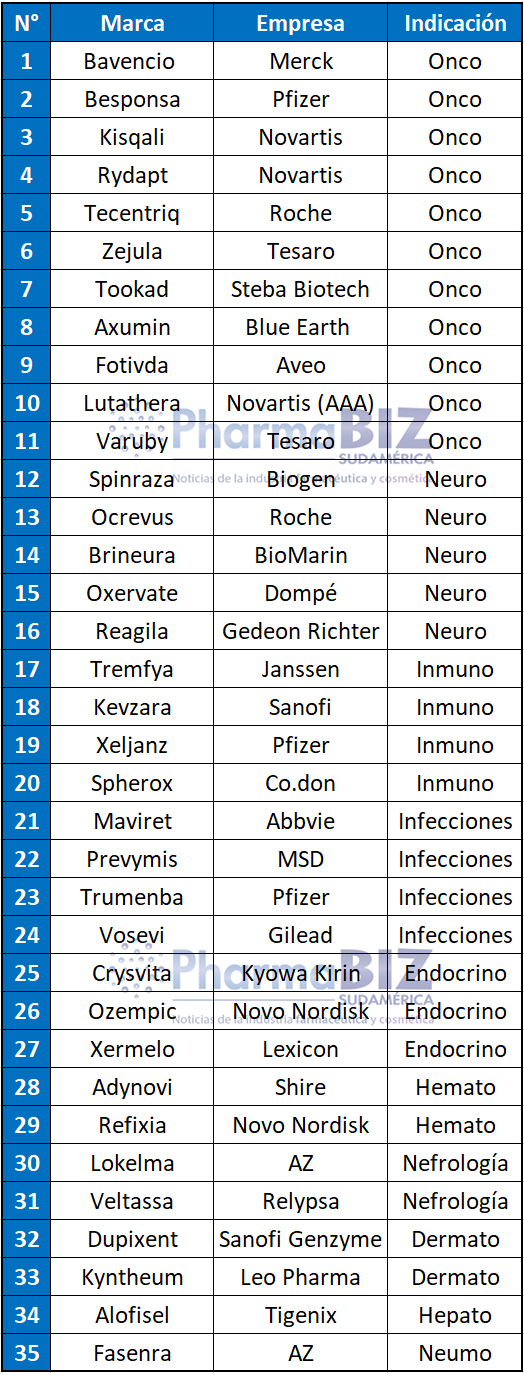 Según el informe, la EMA aprobó 11 productos oncológicos el año pasado. Figuran Bavencio, de la alemana Merck, indicado para un tipo de cáncer de piel específico; Besponsa, de Pfizer, para tratar la leucemia linfoblástica aguda refractaria; Kisqali de la suiza Novartis, para cáncer de mama. Novartis también obtuvo la venia para Rydapt, con dos indicaciones: leucemia mieloide aguda y trastornos en sangre.