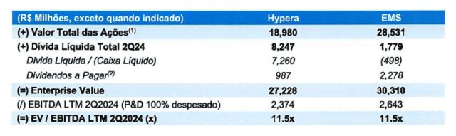 Según la propuesta de combinación de negocios la oferta de EMS incluye la compra de hasta el 20% de las acciones de Hypera a R$30 (u$s 5,28) cada una, lo que representa una prima del 17% sobre el precio de cierre del viernes 18 de octubre. Por otro lado, también plantea un canje de acciones.