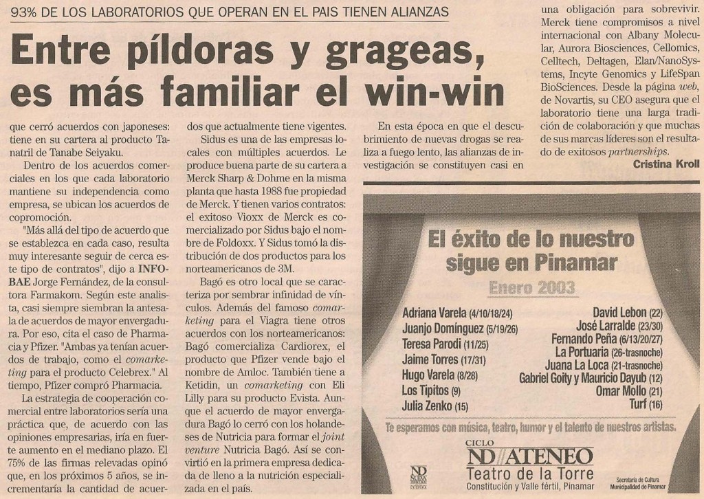 «Más allá del tipo de acuerdo que se establezca en cada caso, resulta muy interesante seguir de cerca este tipo de contratos», dijo a INFOBAE Jorge Fernández, de la consultora Farmakom. Según este analista, casi siempre siembran la antesala de acuerdos de mayor envergadura. Por eso, cita el caso de Pharmacia y Pfizer. «Ambas ya tenían acuerdos de trabajo, como el comarketing para el producto Celebrex.» Al tiempo, Pfizer compró Pharmacia.