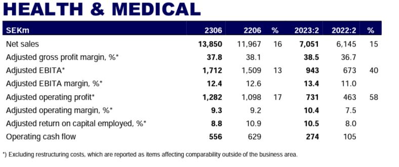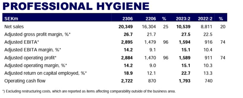 En un análisis del desempeño por segmentos de negocios, la sueca reportó que su unidad de Health & Medical ascendió 15,7% a SEK 13.850 millones (u$s 1.351,3 millones), en tanto que Consumer Goods avanzó 19,8% a SEK 52.653 millones (u$s 5.137,2 millones) y Professional Hygiene subió 24,8% a SEK 20.349 millones (u$s 1.985,4 millones).