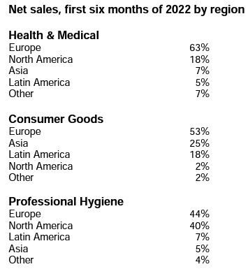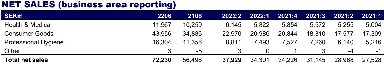 En un análisis del desempeño por segmentos de negocios, la sueca reportó que su unidad de Health & Medical ascendió 17% a SEK 11.967 millones (u$s 1.168,9 millones), en tanto que Consumer Goods avanzó 26% a SEK 43.956 millones (u$s 4.293,3 millones) y Professional Hygiene subió 44% a SEK 16.304 millones (u$s 1.592,5 millones).