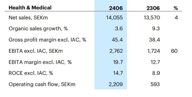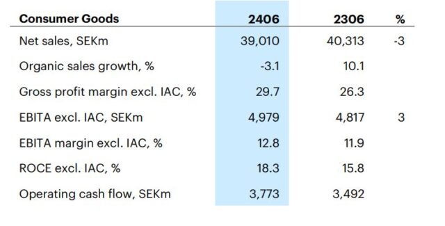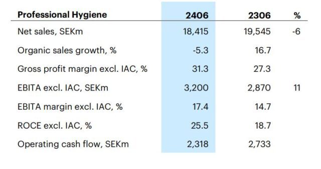 En un análisis del desempeño por segmentos de negocios, la compañía que tiene a Magnus Groth como presidente y CEO reportó que su unidad de Health & Medical ascendió 4% a SEK 14.055 millones (u$s 1.332 millones), en tanto que Consumer Goods retrocedió -3% a SEK 39.010 millones (u$s 3.696 millones) y Professional Hygiene cayó -6% a SEK 18.415 millones (u$s 1.745 millones).