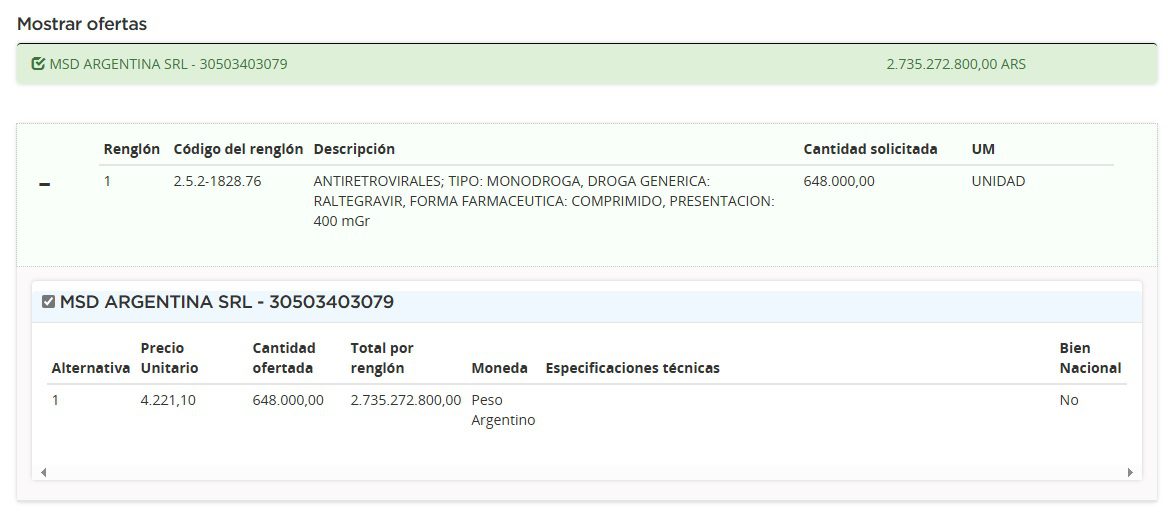 Según el desglose realizado por el equipo de analistas de Pharmabiz, la norteamericana MSD realizó una oferta total por las 10.800 cajas de 60 comprimidos a base de raltegravir 400 mg. La suma alcanza los $2.735 M (u$s 2.36 M). Ver Cuadro Comparativo