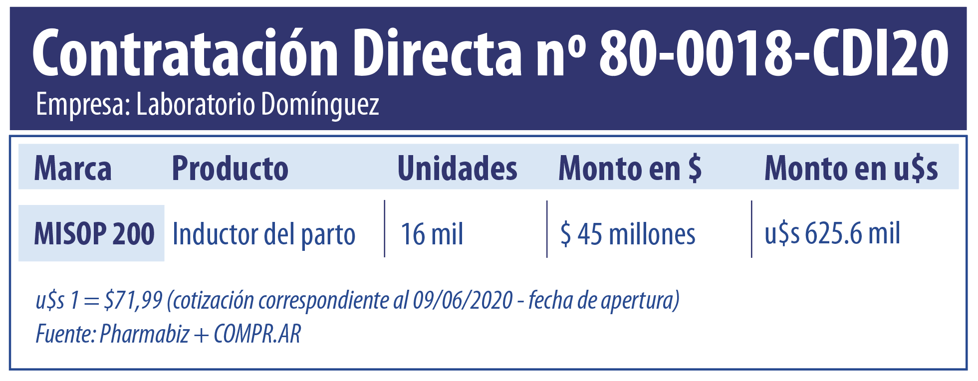 En el mercado local, el único que tiene un inductor del parto basado en misoprostol es el laboratorio nacional Dominguez. Aunque, cabe aclarar que el llamado de hoy sólo se constituye en una instancia de apertura. De efectivizarse la contratación, la empresa le vendería al Estado 16 mil unidades de su marca MISOP 200 por un monto de $45 millones (u$s 625.6 mil).