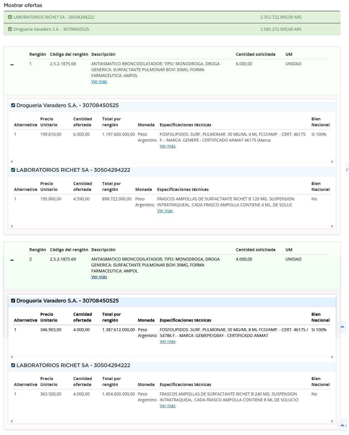 La otra empresa en ofertar fue la nacional Richet, que se presentó para una cantidad parcial del primer renglón y la totalidad del segundo con su marca Surfactante B Richet por $2.352 M (u$s 1.84 M). Ver Cuadro Comparativo