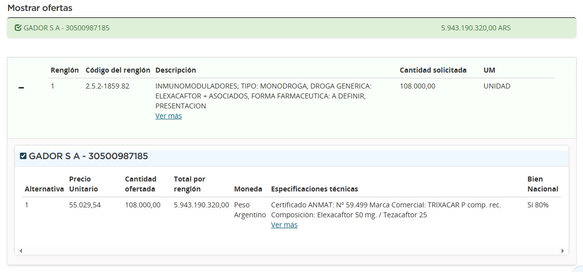 En el proceso se solicitaron 1.200 cajas de Trixacar P, cada una conteniendo 90 comprimidos a base de elexacaftor 50 mg; tezacaftor 25 mg; ivacaftor 37.5 mg e ivacaftor 75 mg. Al momento de la apertura, Gador presentó una cotización de $55.029 (u$s 42) por unidad; por los 108 mil comprimidos requeridos, el total alcanza los $5.943 M (u$s 4.5 M). Ver Cuadro Comparativo