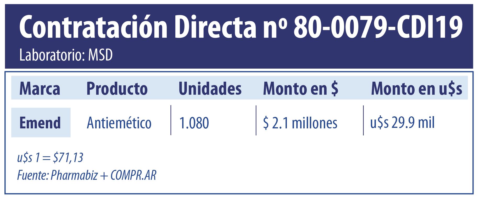 El Estado puso en marcha una contratación directa para comprarle antieméticos a la norteamericana MSD. La multi le entregaría más de mil unidades de su marca Emend por un total de $2.1 millones (u$s 29.9 mil).