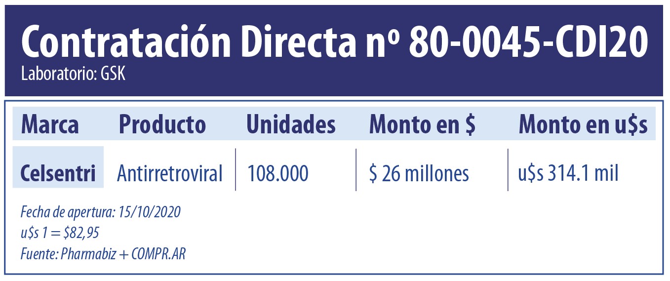 La última vez que el Estado activó una compra de este producto a base de maraviroc, fue en junio del 2019. La por entonces Secretaría de Salud de la Nación, que estaba comandada por Adolfo Rubinstein, reflotó un proceso que había quedado desierto un mes antes y así destinó $23.8 millones (u$s 521.4 mil*) por 156 mil unidades. Ver artículo.