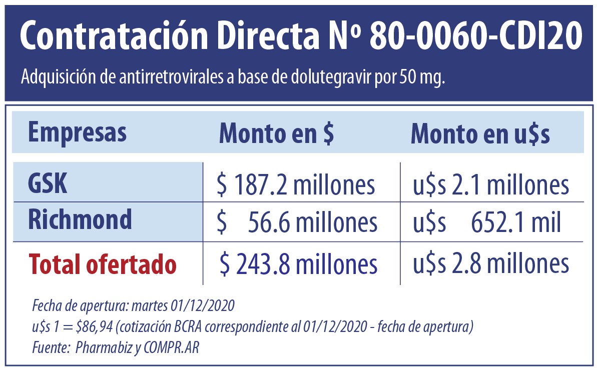 A la compulsa se presentaron dos compañías. Por un lado, el laboratorio nacional Richmond, quien ofreció el precio unitario más bajo. Cada unidad de su producto Zevuvir fue cotizada en $34.5 (u$s 0.4), y de resultar elegida podría facturar una suma de $56.6 millones (u$s 652.1 mil) por la entrega de 1.6 millones de su medicamento a base de dolutegravir por 50mg. El mismo fue lanzado el año pasado y se manufactura en la planta que la empresa tiene en Pilar.
