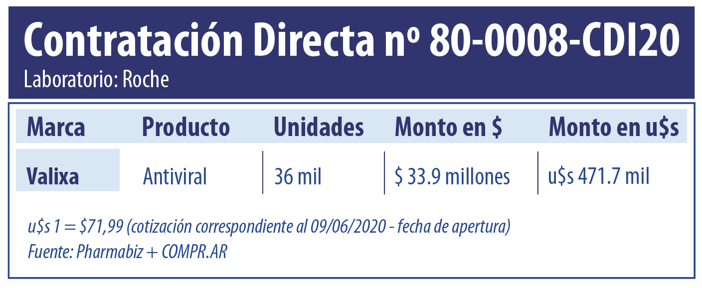 El proceso implicaría un desembolso por parte del Estado de $33.9 millones (u$s 471.7 mil) por 36 mil unidades del antiviral Valixa, el que lleva el sello de la suiza Roche. El producto a base de valganciclovir se presenta en comprimidos por 450 mg. Ver contratación