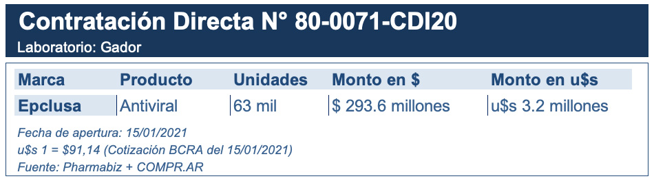 El Ministerio de Salud de la Nación está terminando la primera quincena de enero con una nueva compra pública. Hoy viernes puso en marcha una Contratación Directa por Exclusividad a fin de adquirir antivirales al laboratorio nacional Gador. Ver contratación directa.