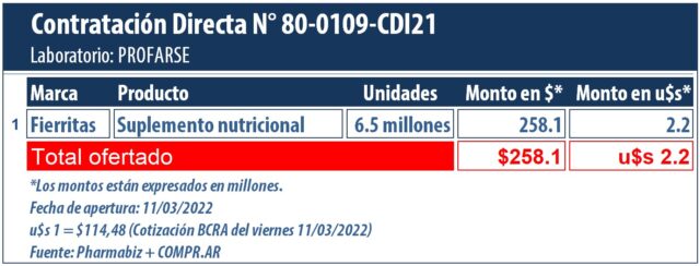 Para este proceso, y según se expresa en el Convenio Interadministrativo con fecha miércoles 2 de marzo, se había fijado el precio unitario máximo que la PROFARSE podía cotizar a fin de cubrir el renglón. Se solicitaron 6.5 millones de unidades de Fierritas, para las que se estableció un valor tope de $38,06 (u$s 0,33) la unidad. Sin embargo, en el acto de apertura de hoy, viernes 11 de marzo, la oferta de PROFARSE superó el límite definido desde el Ministerio de Salud de la Nación, con $39,33 (u$s 0,34) por cada sobre de Fierritas. De modo que la provisión de estos suplementos nutricionales equivaldría -una vez adjudicada la compra- a un total de $258.1 millones (u$s 2.1 millones). Ver Convenio Interadministrativo