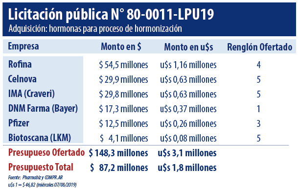 En tercer orden resalta el laboratorio IMA que figura en nombre del nacional Craveri con una propuesta que alcanza los $29.8 millones (u$s 636.4 mil). Su interés radica en el renglón correspondiente a la hormona a base de ciproterona, que es comercializada por Craveri con el nombre Hitoron.