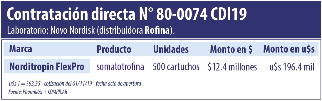 El Estado desembolsará $12.4 millones (u$s 196.4 mil) en pos de comprar Norditropin FlexPro, una hormona de crecimiento que lleva el sello de la danesa Novo Nordisk. Fue luego de declarar como «fracasada» una contratación de similares características abierta a fines de octubre.