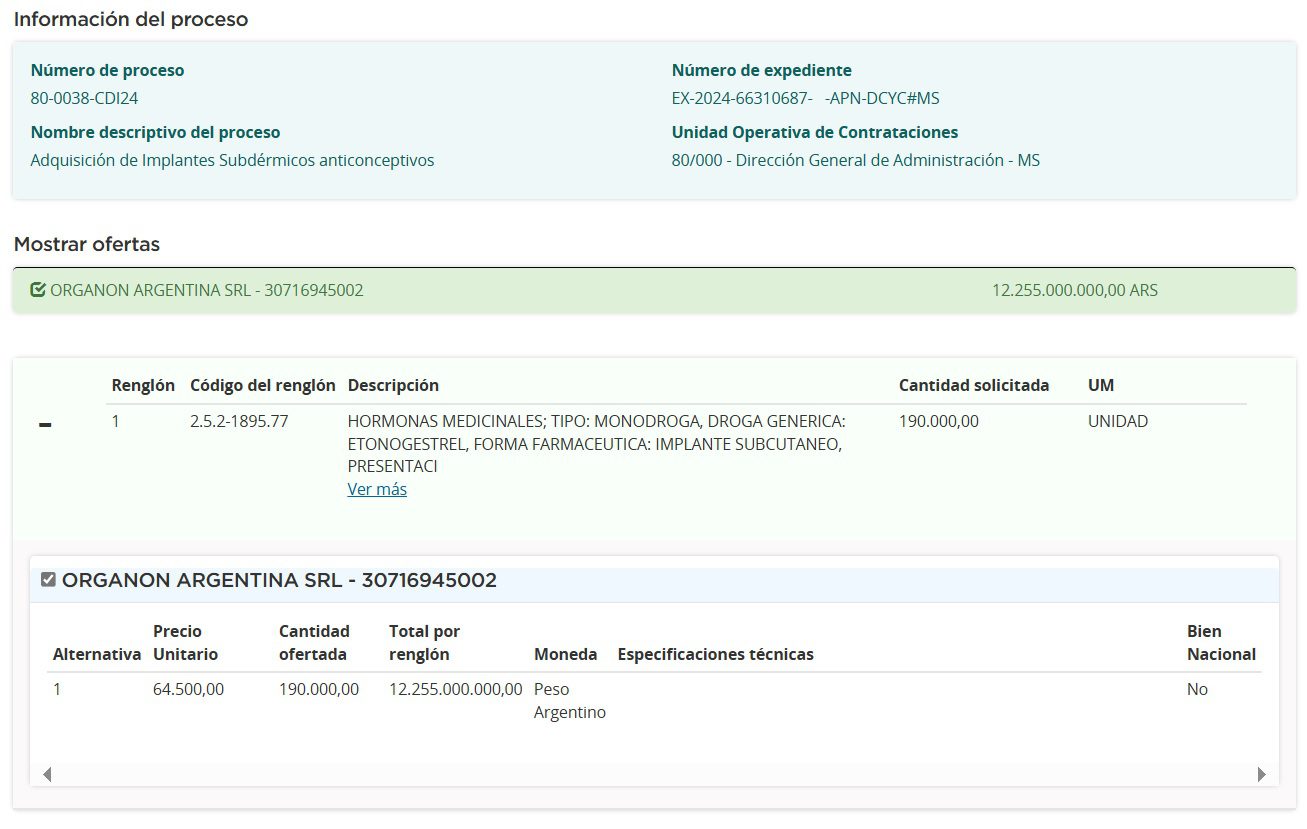 Mediante este proceso, la norteamericana Organon podría proveerle al Estado 190.000 unidades de su producto Implanon NXT, cada una a $64.500 (u$s 65,3). Para el conjunto la multi cotizó $12.255 M (u$s 12,4 M). Ver Cuadro Comparativo