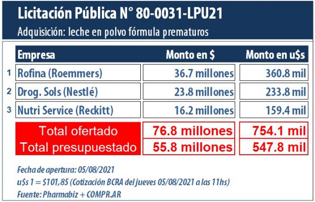 A fines del 2020 el Estado adjudicó una licitación pública de fórmulas infantiles para prematuros. La cartera sanitaria emitió en noviembre del año pasado las pertinentes órdenes de compra por un total de $38.2 millones (u$s 404.1 mil*). De esa cifra, $19.6 millones (u$s 231.9 mil*) correspondieron a la suiza Nestlé por la entrega de 10 millones de unidades de su etiqueta Pre NAN; mientras que $18.6 millones (u$s 220 mil*) al grupo Roemmers, que resultó ganador para proveer al Ministerio de Salud con 10 millones de unidades de su etiqueta NutriBaby. Ver «Compra fórmulas para prematuros, preadjudicada»