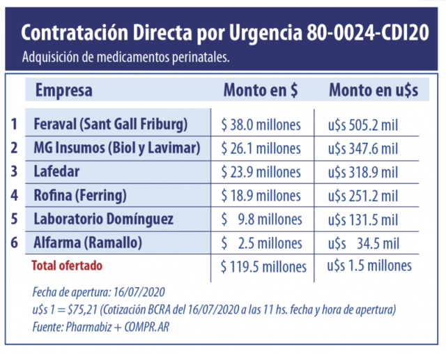 En este julio de pandemia, el Ministerio de Salud de la Nación puso en marcha una nueva compra pública para adquirir medicamentos perinatales. El total ofertado asciende los $119.5 millones (u$s 1.5 millones).