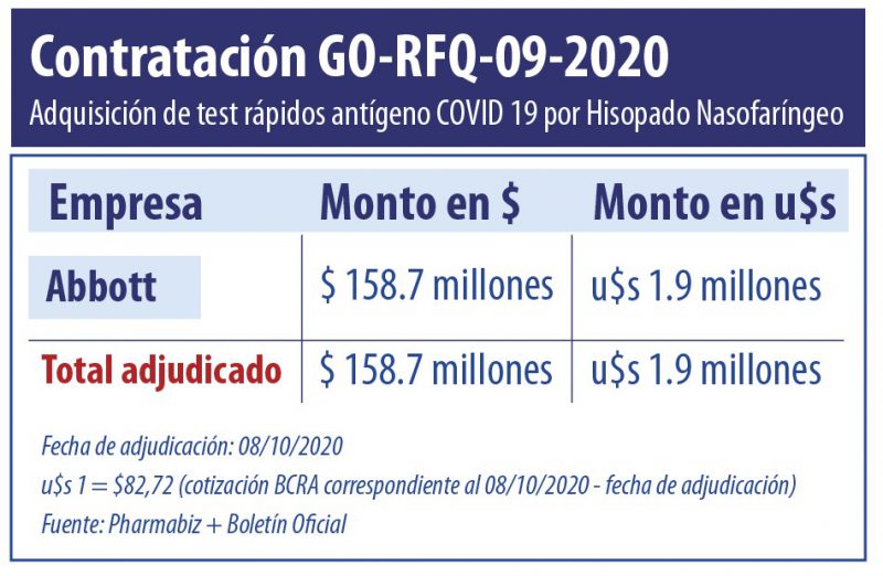 La norteamericana Abbott resultó adjudicataria de una compra pública de tests de antígenos rápidos. La misma implicará una erogación por parte del Estado de $158.7 millones (u$s 1.9 millones). El proceso se da en el marco de un Contrato de Préstamo rubricado entre la Argentina y el Banco Internacional de Reconstrucción y Fomento -BIRF-.