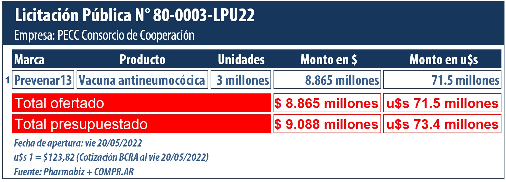 En junio de 2020, el Estado amplió una licitación trianual enfocada en la compra de dosis de Prevenar13 y que estaba vigente desde el 2017. La misma se amplificó un 35% por un total de $5.786 millones (u$s 79.1 millones*). Ver artículo Vacunas: amplían licitación.
