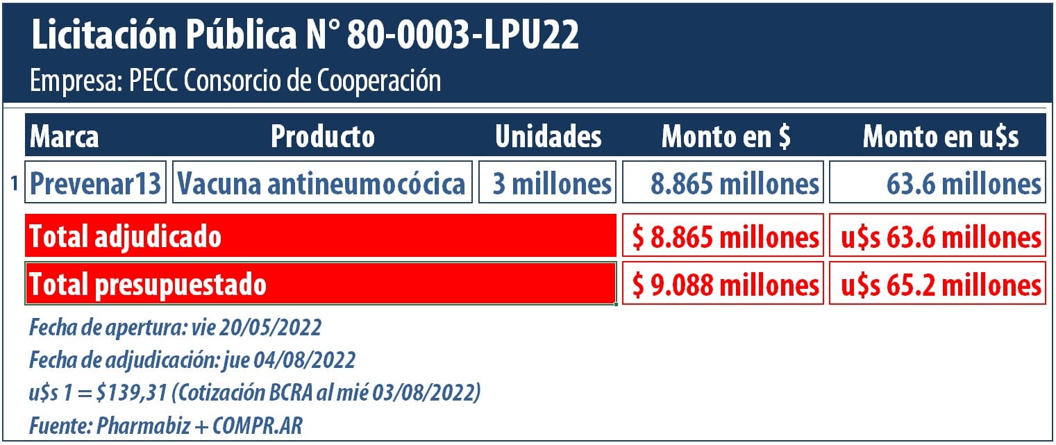 En junio de 2020, el Estado amplió una licitación trianual enfocada en la compra de dosis de Prevenar13 y que estaba vigente desde el 2017. La misma se amplificó un 35% por un total de $5.786 millones (u$s 79.1 millones*). Ver artículo Vacunas: amplían licitación.