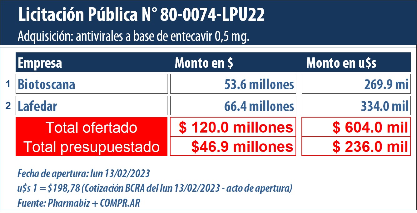 De acuerdo con el desglose realizado por el equipo de analistas de Pharmabiz, una dupla de empresas se presentó en la compulsa, las que podrían proveer el total de las partidas. El grupo Biotoscana, propiedad del grupo canadiense Knight Therapeutics, se anotó con su marca Teneir y la oferta más económica. El laboratorio se registró con un precio unitario de $346,65 (u$s 1,74), lo que se traduce en una suma de $53.6 millones (u$s 269.9 mil). En segundo lugar, figura el entrerriano Lafedar, con su marca B-cavir. La compañía cotizó cada unidad a $429,00 (u$s 2,15), lo que representa un monto total de $66.4 millones (u$s 334.0 mil). Ver Cuadro Comparativo.