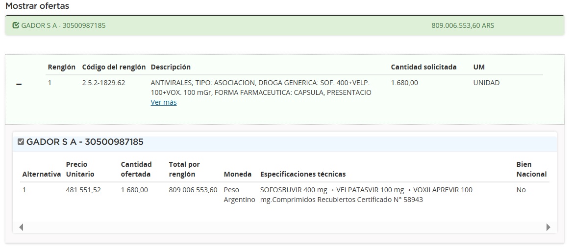 Mediante este proceso, la cartera que dirige Mario Lugones tiene previsto comprar 60 cajas de 28 comprimidos recubiertos del medicamento, desarrollado a base de sofosbuvir 400 mg, velpatasvir 100 mg y voxilaprevir 100 mg. De acuerdo al análisis realizado por el equipo de Pharmabiz, el laboratorio, propiedad de las familias Álvarez Saavedra y Fabbri, y en el que también tiene injerencia el Grupo Roemmers, podría percibir ingresos por $809 M (u$s 678.219). Ver cuadro comparativo