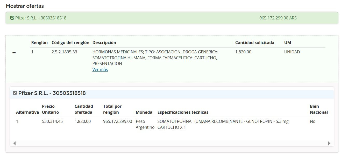 Un proceso de compra directa enfocado en adquirir la hormona de crecimiento Genotropin, de la norteamericana Pfizer, tuvo su acto de apertura hoy. En paralelo, aún hay dos contrataciones en curso relativas a somatropina. Una con el laboratorio Biosidus, y otra con la Merck alemana.