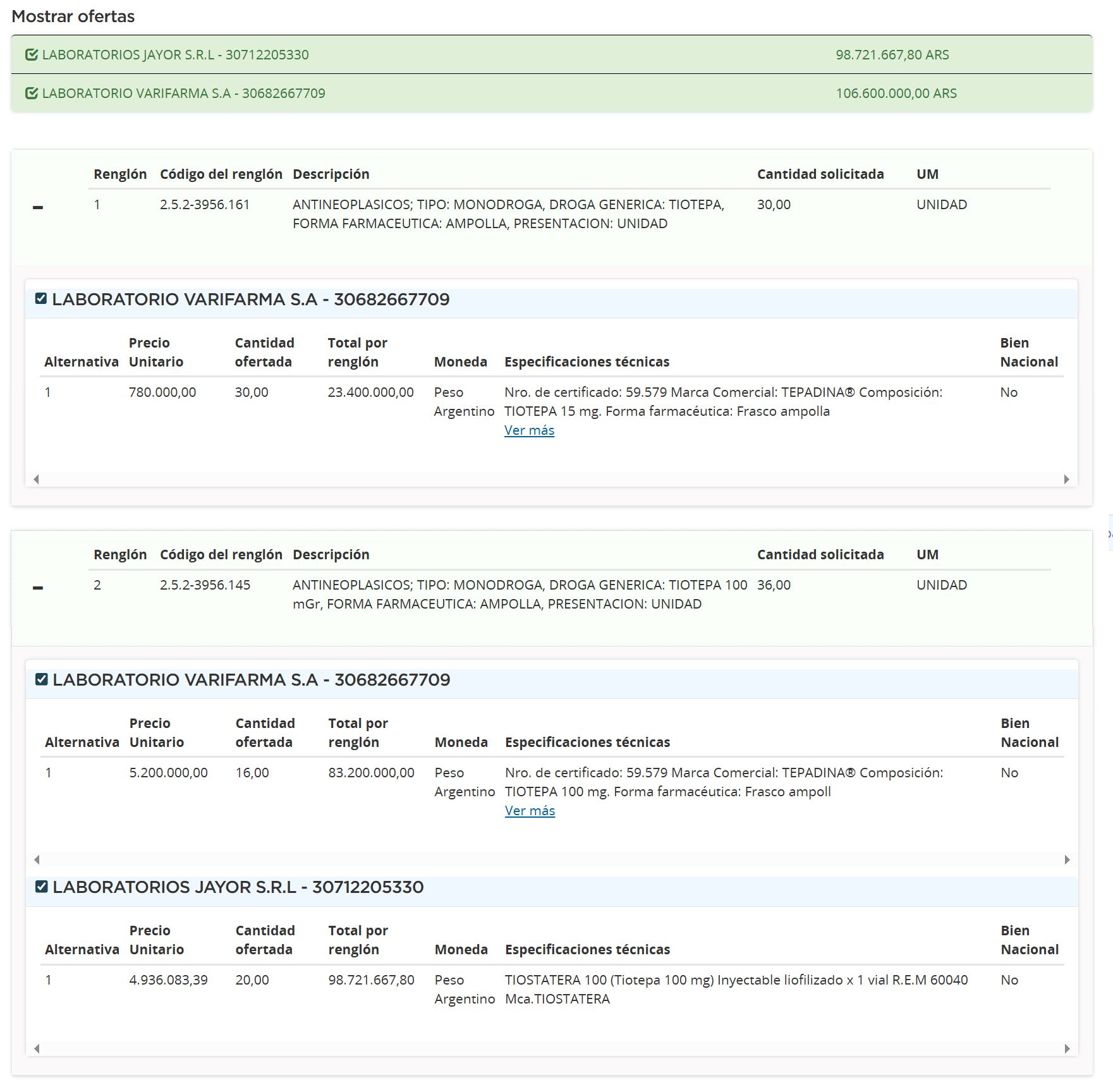 Durante la apertura se registraron ofertas de dos compañías. Por un lado, Varifarma alzó la mano con su etiqueta Tepadina, con la que podría facturar hasta $106.6 M (u$s 81.540) de ser seleccionada en ambos renglones. También se presentó Jayor, que apunta a cotizar $98.7 M (u$s 75.513) por 20 unidades de su marca Tiostatera. Ver Cuadro Comparativo