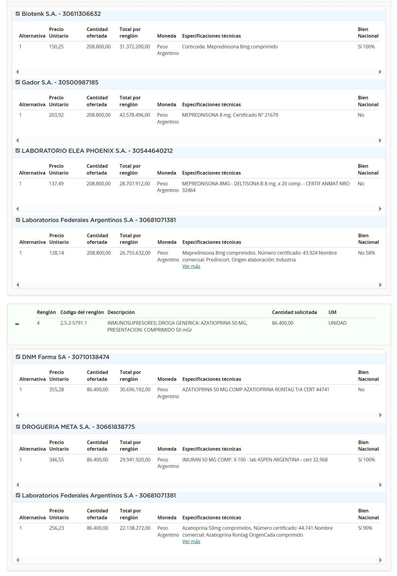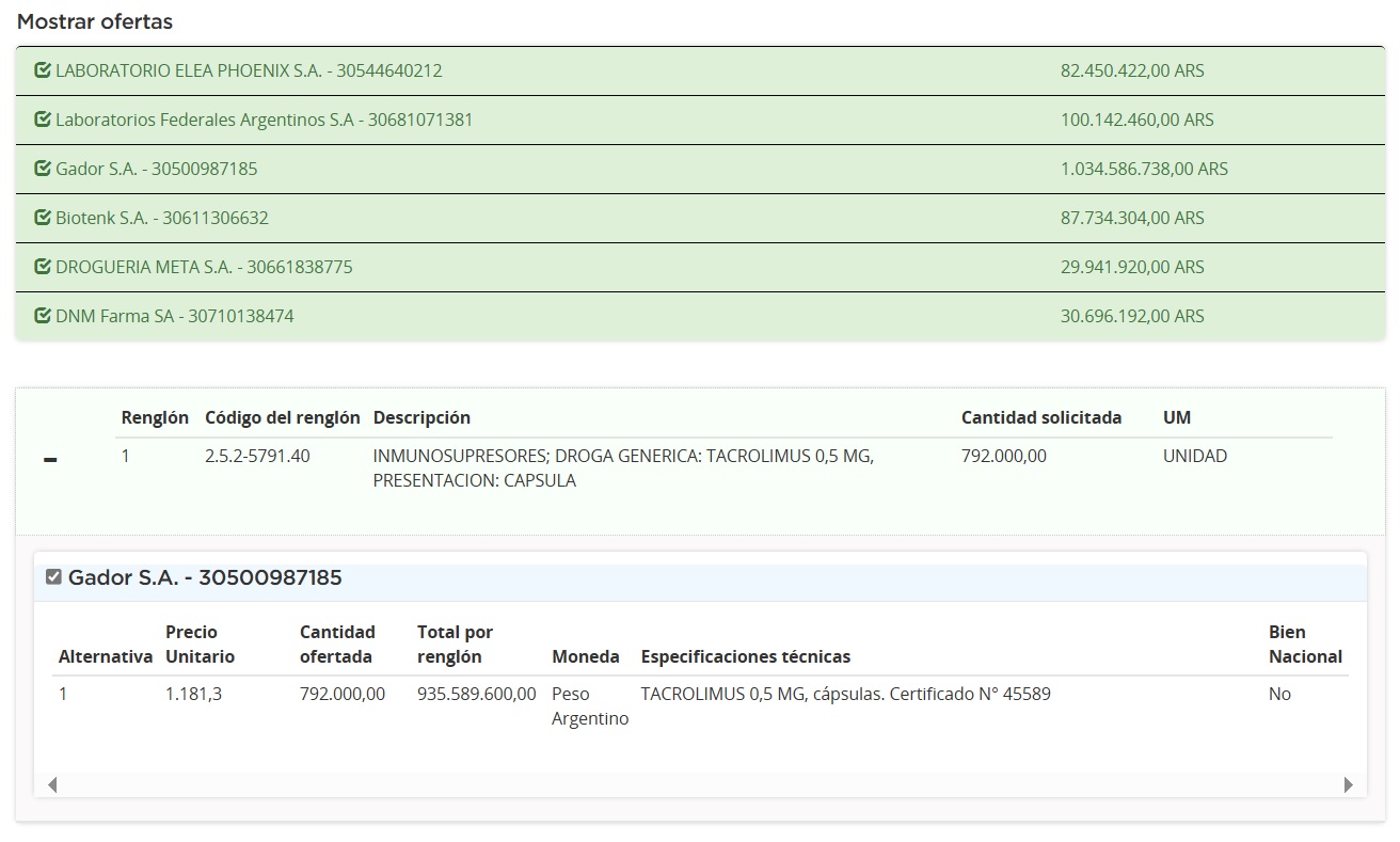 De acuerdo con el análisis realizado por el equipo de Pharmabiz, un total de seis empresas se presentaron en la compulsa. La principal oferente en términos de facturación fue la nacional Gador que cotizó una suma de $1.034,6 M (u$s 961.360). La compañía se anotó en tres renglones a fin de proveerle al Estado de partidas de su inmunosupresor Prograf; y su corticoide Cortipyren, a base de meprednisona 4 mg y 8mg. Ver Cuadro Comparativo de Ofertas