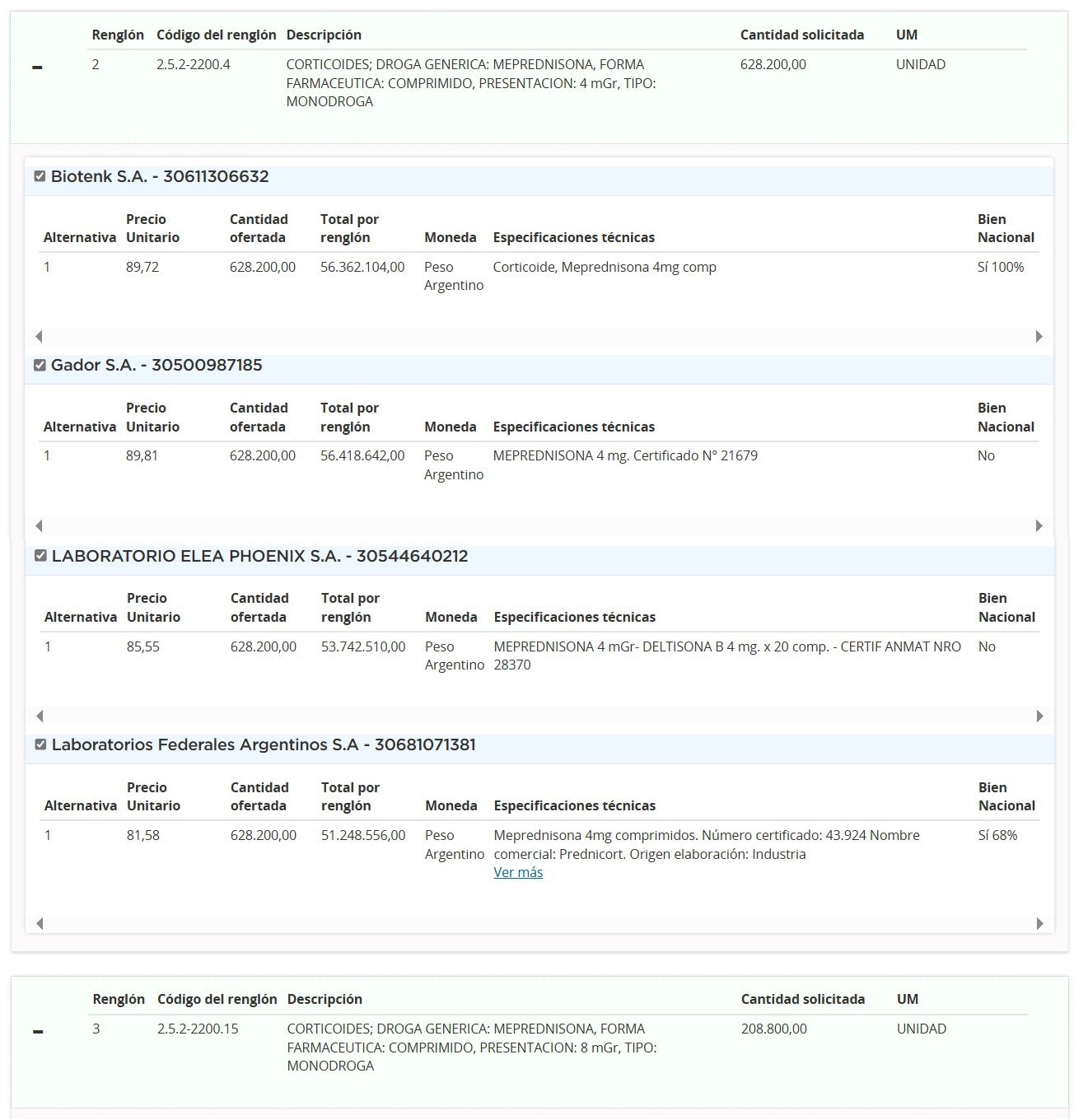 En tanto, otras tres empresas que figuran en el listado de oferentes compiten, junto con Gador, en el renglón correspondiente a corticoides a base de meprednisona 4 mg. El laboratorio nacional Elea cotizó con su medicamento Deltisona B, por $53,7 M (u$s 49.939). También ofertaron el entrerriano Lafedar, por una suma de $51,3 M (u$s 47.621); y Biotenk mediante un monto de $56,4 M (u$s 52.373).