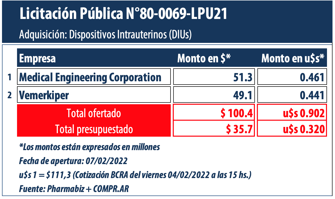 En octubre del 2021, el Estado había puesto en marcha una contratación directa por exclusividad enfocada en la compra de DIUs a la alemana Bayer. El proceso se definió a fines del año pasado por un total de $80.1 millones (u$s 752.2 mil*), equivalentes a 10 mil unidades de su dispositivo Mirena. Ver artículo: «Bayer a contratación directa, DIUs».