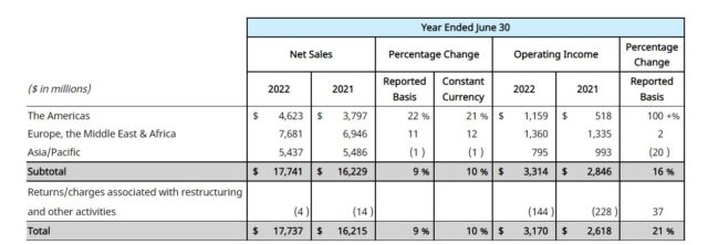 En ellos reportó que sus ventas globales escalaron un 10% en moneda constante a u$s 17.737 millones, frente a los u$s 16.215 millones del 2020/21. En su nota de resultados, explicó que sus ingresos netos crecieron en todas las categorías de productos y en la mayoría de las regiones. Ver Press Release.